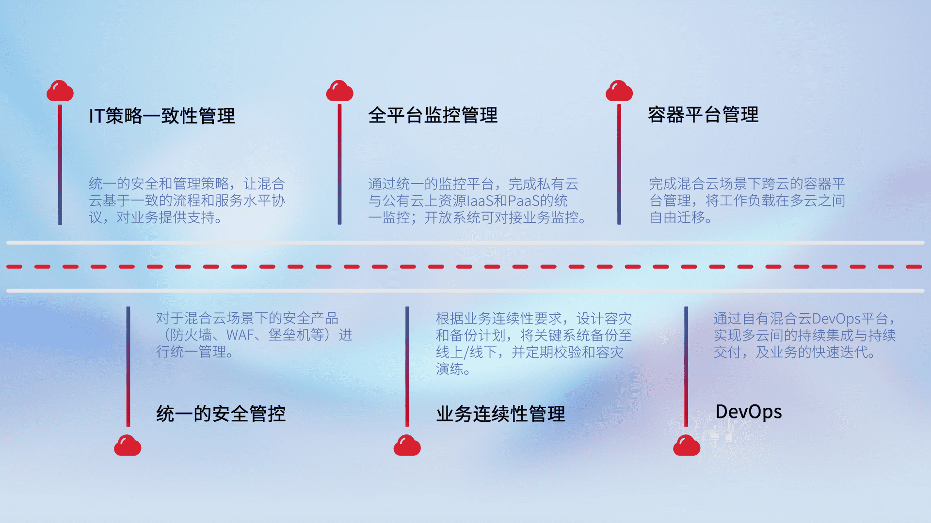 通过多云纳管,,,以统一的资源数据模型把客户的云资源进行抽象和封装,,进而实现对多云资源的统一操作,,,,保障云资源管理的可靠性、、、稳定性与可用性。。。。量身定制化运维内容,,,配置、、开发运维、、、补丁管理、、、备份、、、、监控、、、、认证和访问管理、、审计和日常巡检等,,保障在用云过程中的可靠度,,,,稳定度以及高可用率。。。。