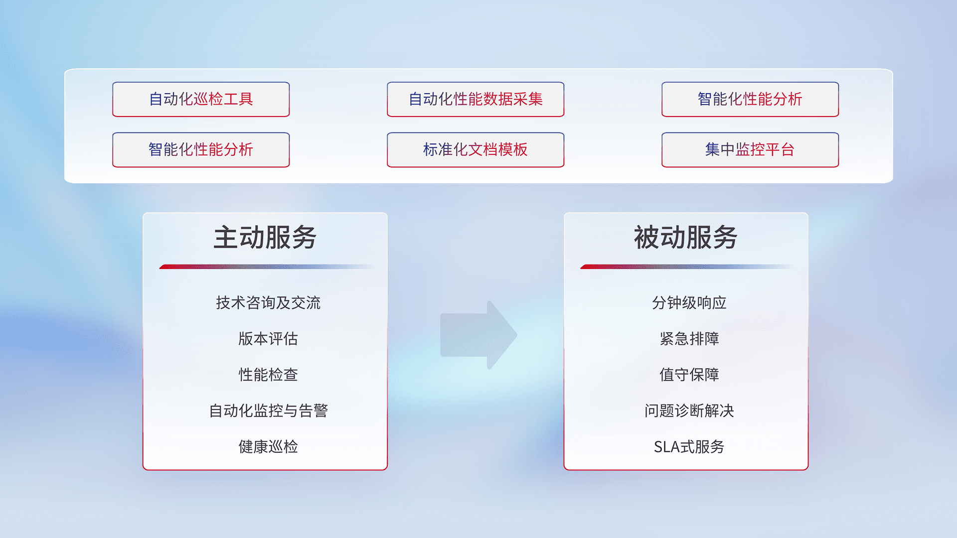 智能化工具和标准化文档,,,保障服务质量,,,,提供主动服务(包含技术咨询、、、、版本评估、、、、性能检查、、自动化监控与告警、、健康巡检)和被动服务包含(分钟级响应、、紧急排障、、值守保障、、问题诊断解决、、、SLA服务)。。。。